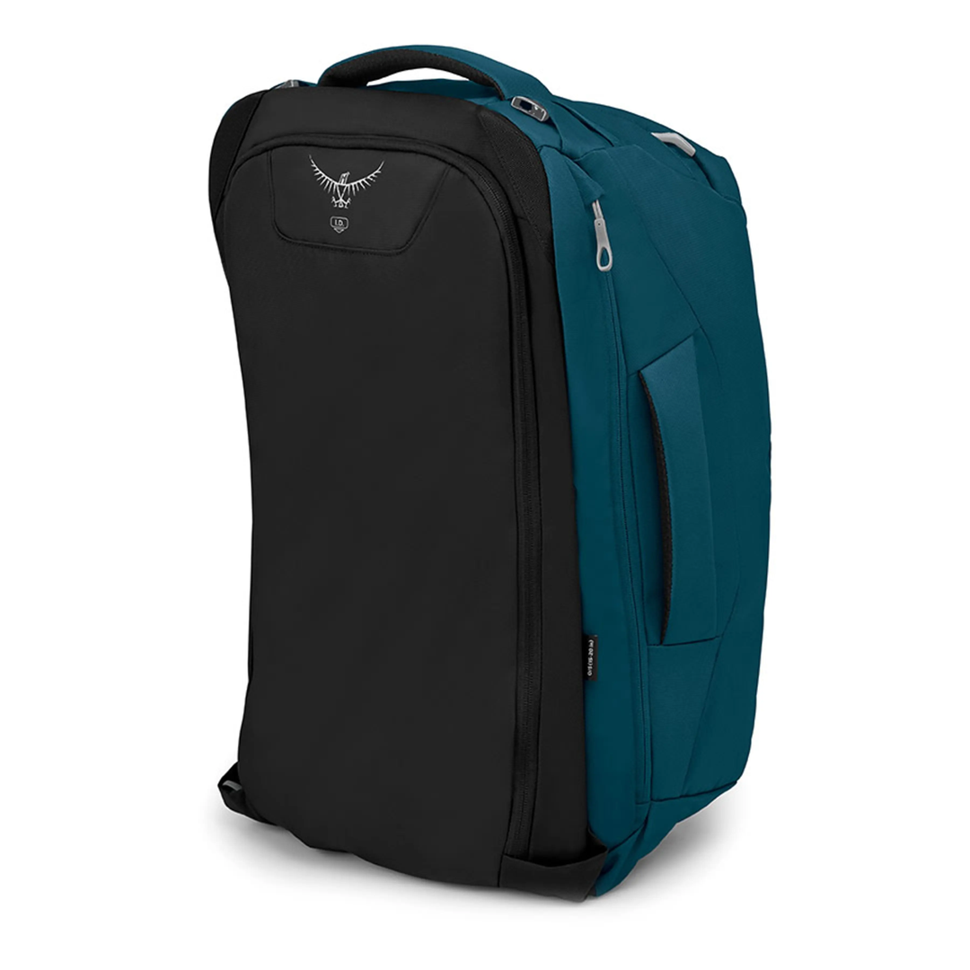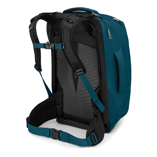 Zaino Fairview 40 blu con cinghie di compressione e maniglioni imbottiti.