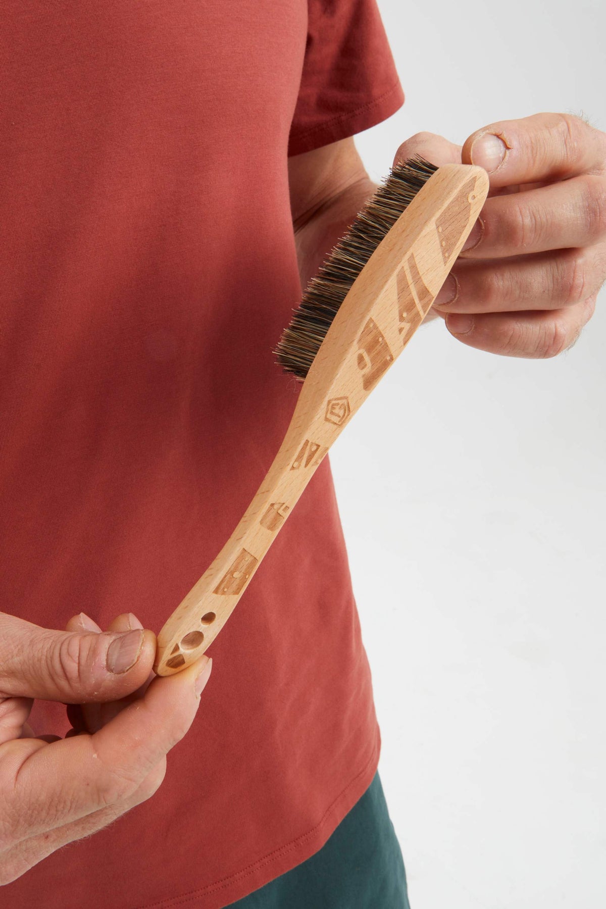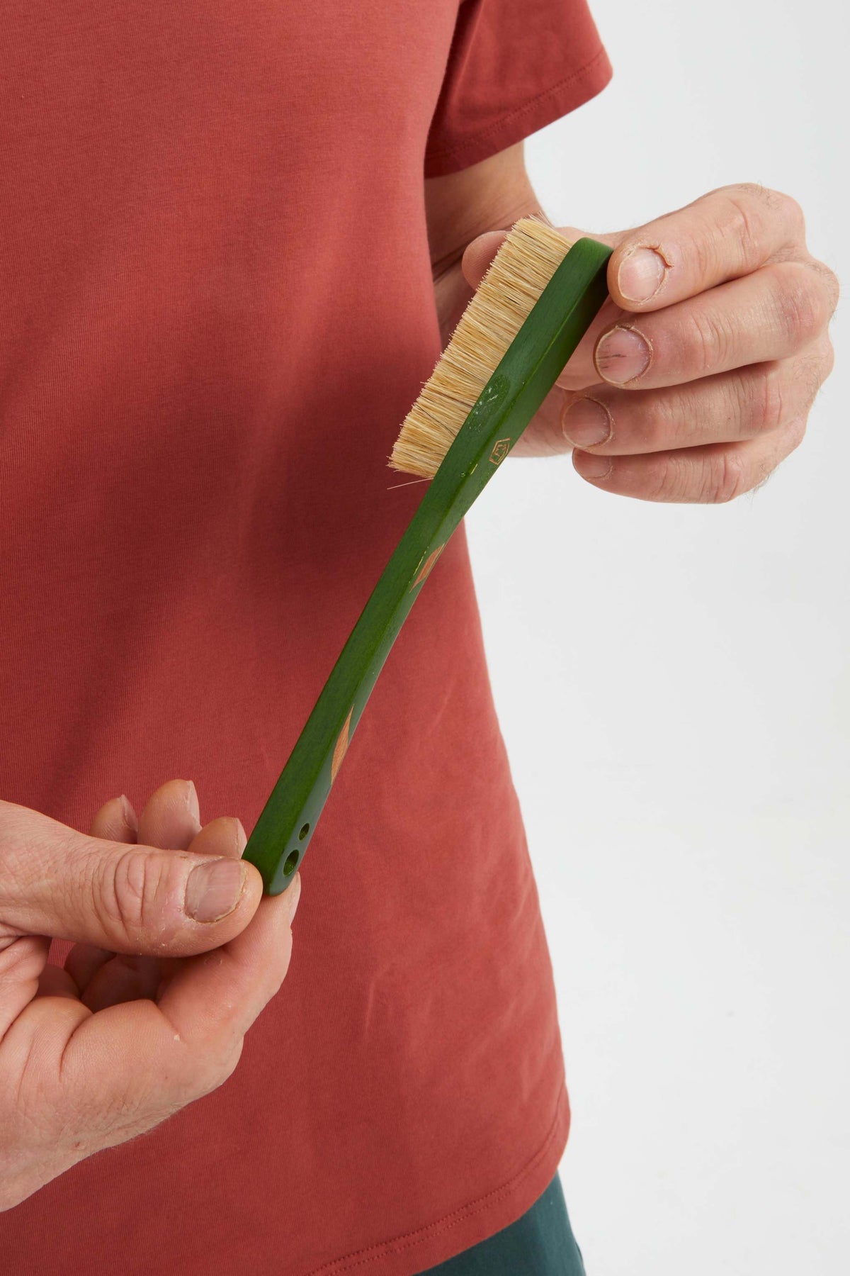 Spazzola da arrampicata realizzata con manico in legno e setole naturali. Progettata per raggiungere grip complessi e garantire durata.
