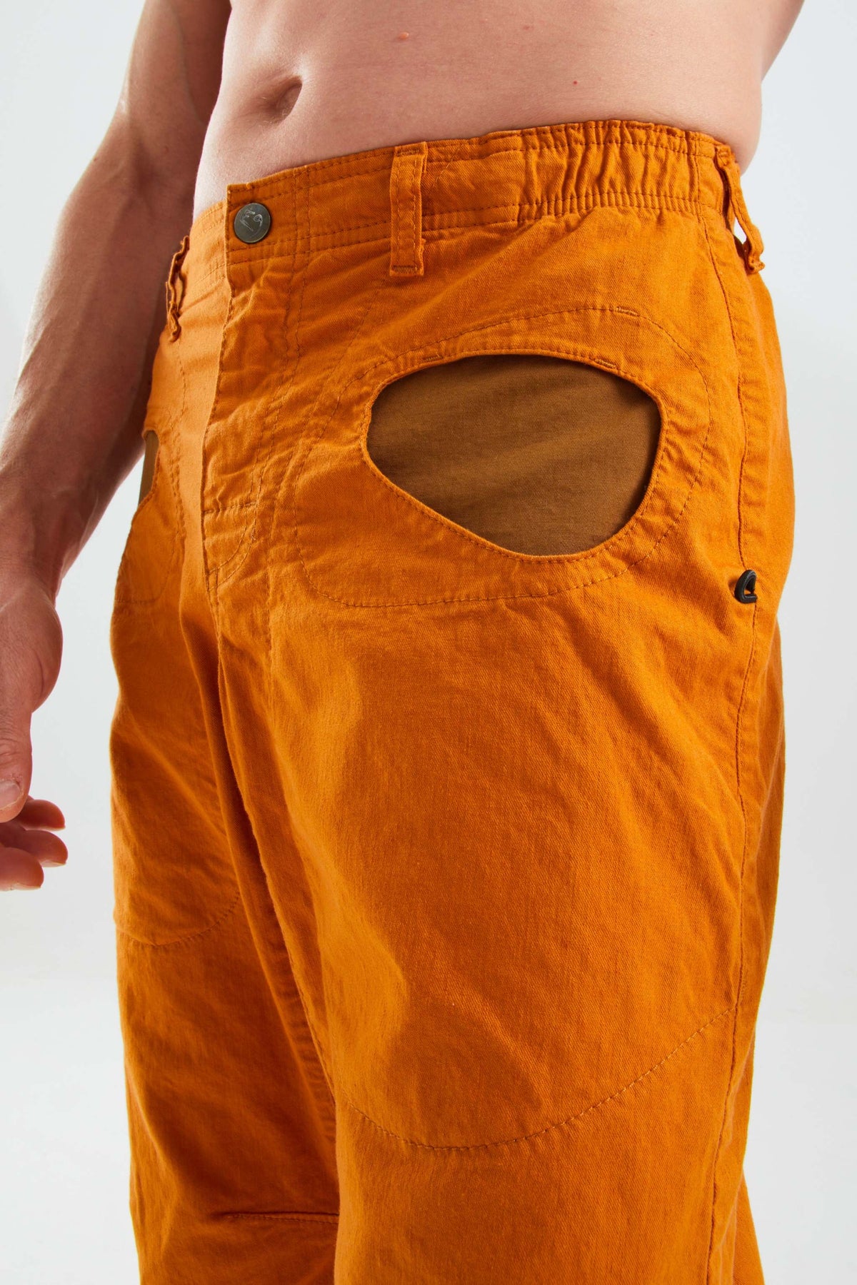 Urban climbing pants made from organic linen and cotton, featuring adjustable hems and waist, internal contrast fabric pockets, and rear embroidery. Made in Italy.