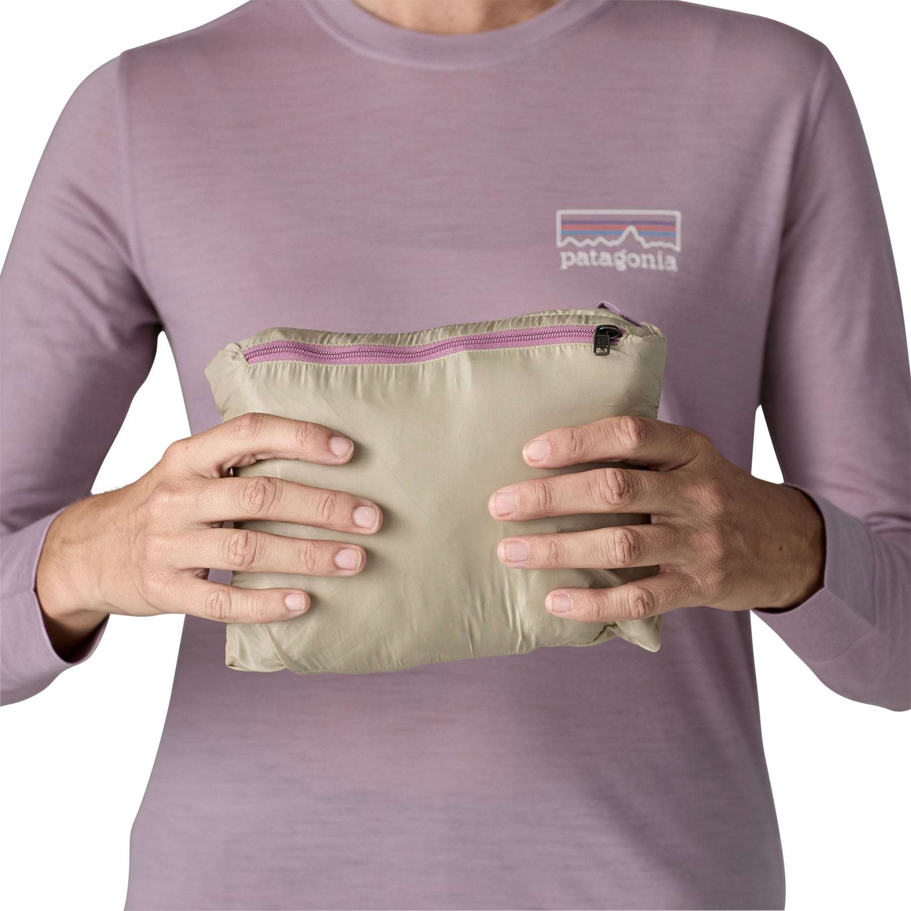 Due tasche scaldamani dotate di zip con alloggio dalla linea essenziale; la tasca interna chiusa da zip sul petto può essere usata come sacca di contenimento in cui ripiegare la giacca ed è dotata di asola interna rinforzata per moschettone