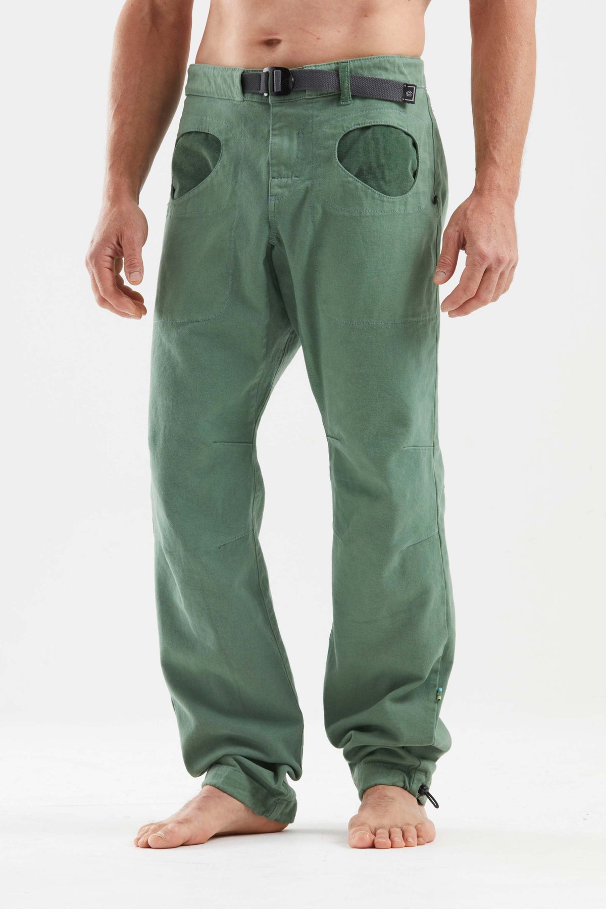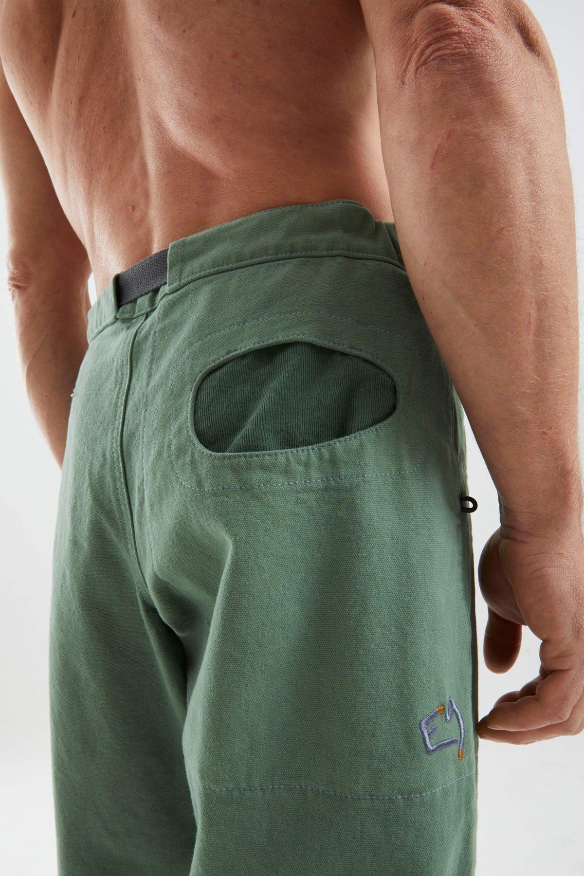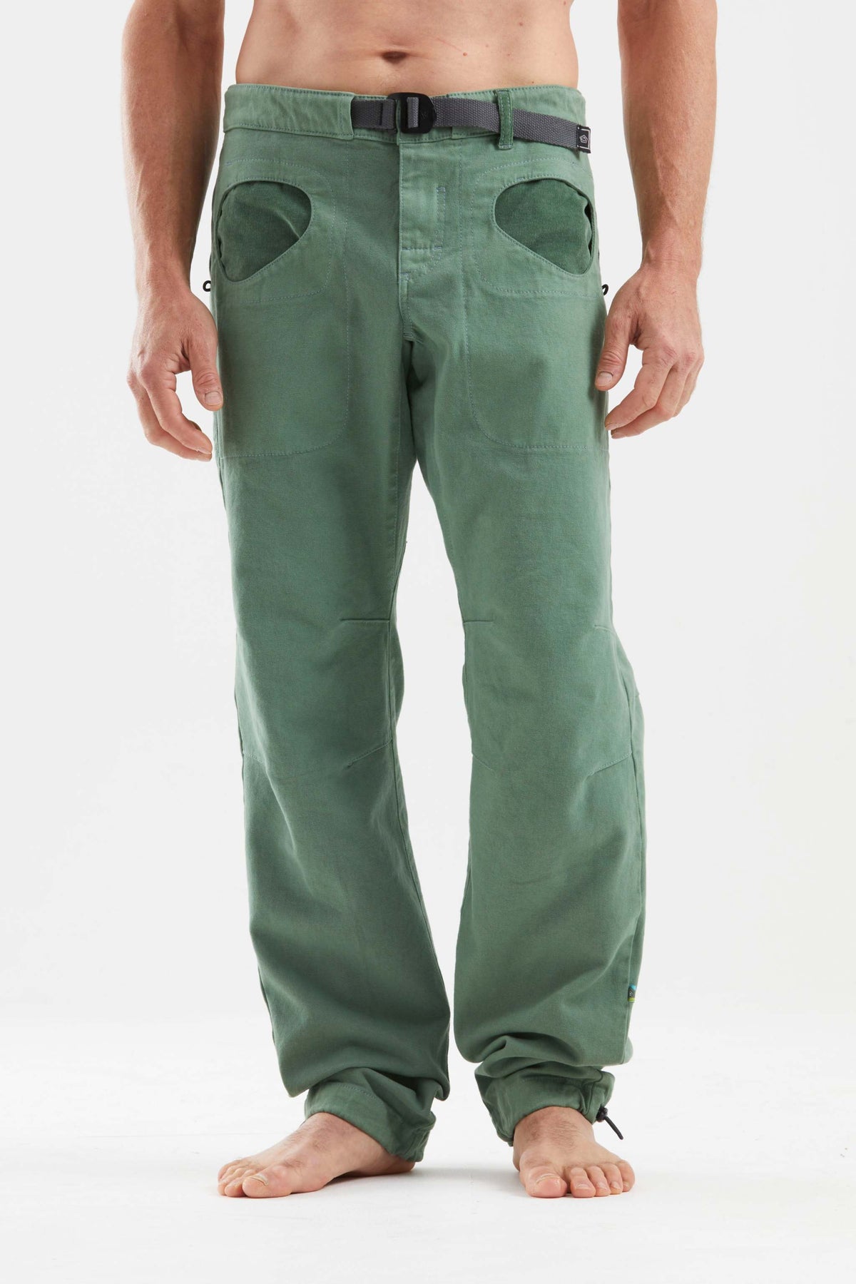 Pantaloni da arrampicata e outdoor in cotone biologico con cintura integrata regolabile a fibbia. Ricamo sul retro, orli regolabili e doppi porta-spazzola per maggiore praticità.