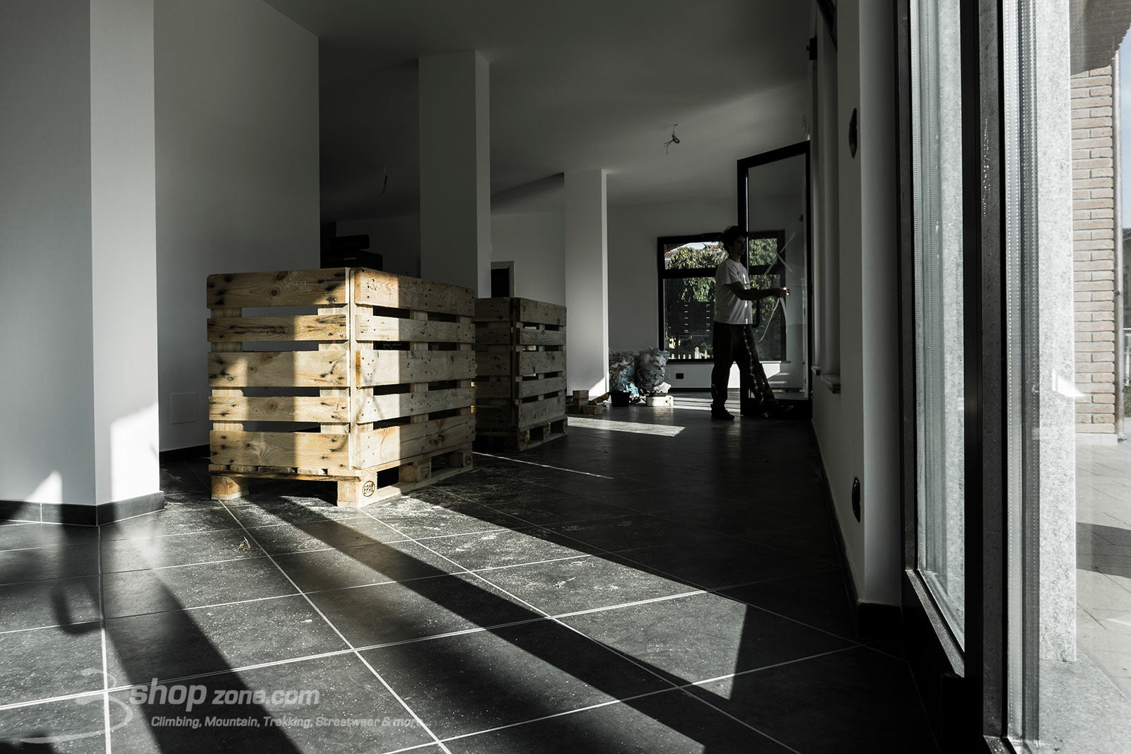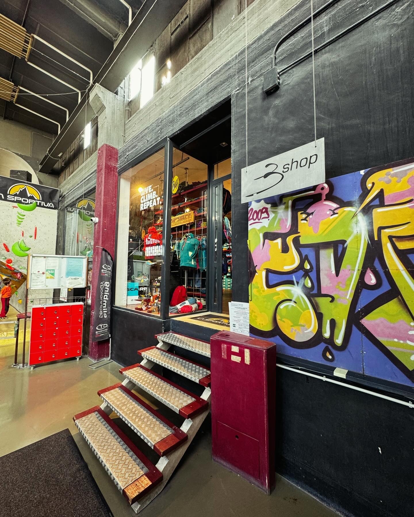 Solo un’asse di legno appoggiata a due cavalletti, una fila di scarpette La Sportiva, la mitica 'Slingshot' (che qualche appassionato vintage ricorderà), un po’ di abbigliamento E9 e qualche rinvio Petzl — l’attrezzatura che per anni mi aveva accompagnato in falesia.